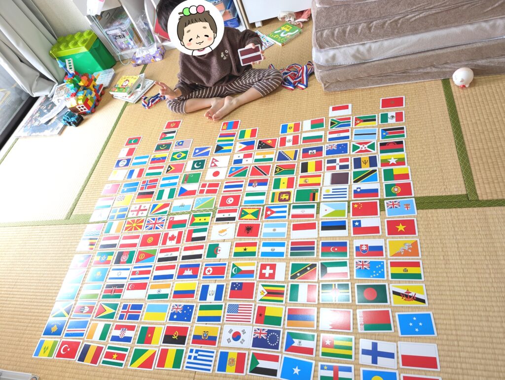 (▼ご参考に、これです。カードの数が多いが子どもはものすごいスピードで覚える&裏面に国の人口や面積などの情報もふりがなつきで載っていて、活字好きの息子はそこも食い入るように読んでます)