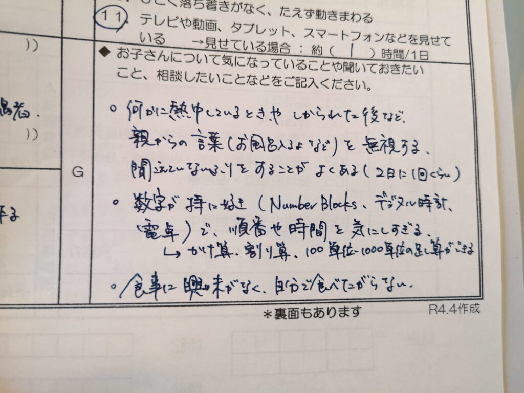 そのときの用紙の写真が出てきた!息子がたぶん3歳半頃に3歳児健診を受けたときのメモ(夫記入)↓