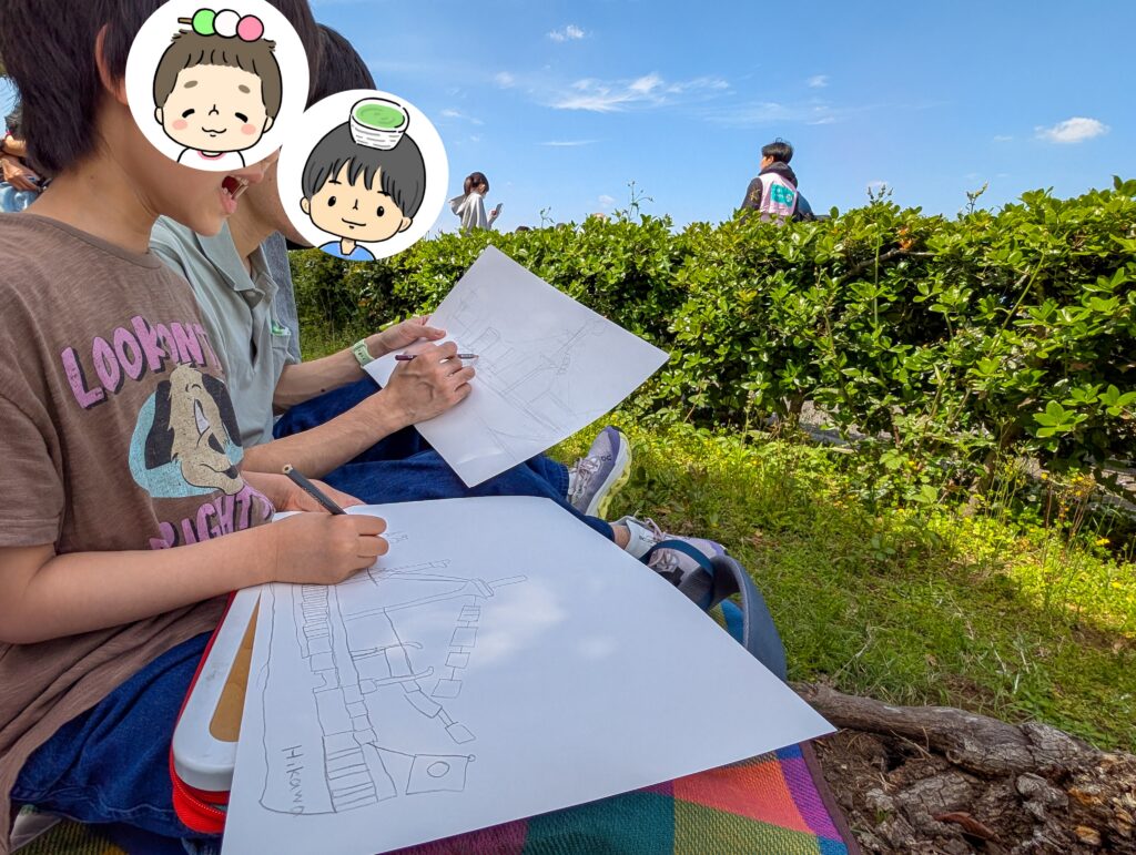 当日は快晴で、まさに写生日和!公園内ではたくさんの人々が思い思いの場所でレジャーシートなどを広げて、筆を走らせていました。