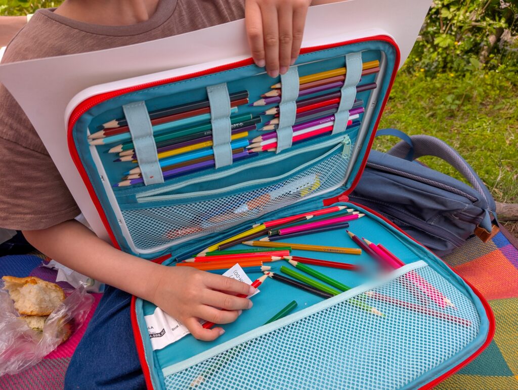 ▼長年愛用中のIKEAのお絵かきケースに雑に50色の色鉛筆を詰め込み持ってきていた息子。この日も大活躍!(ちょっと画用紙のサイズのほうが大きすぎたが)